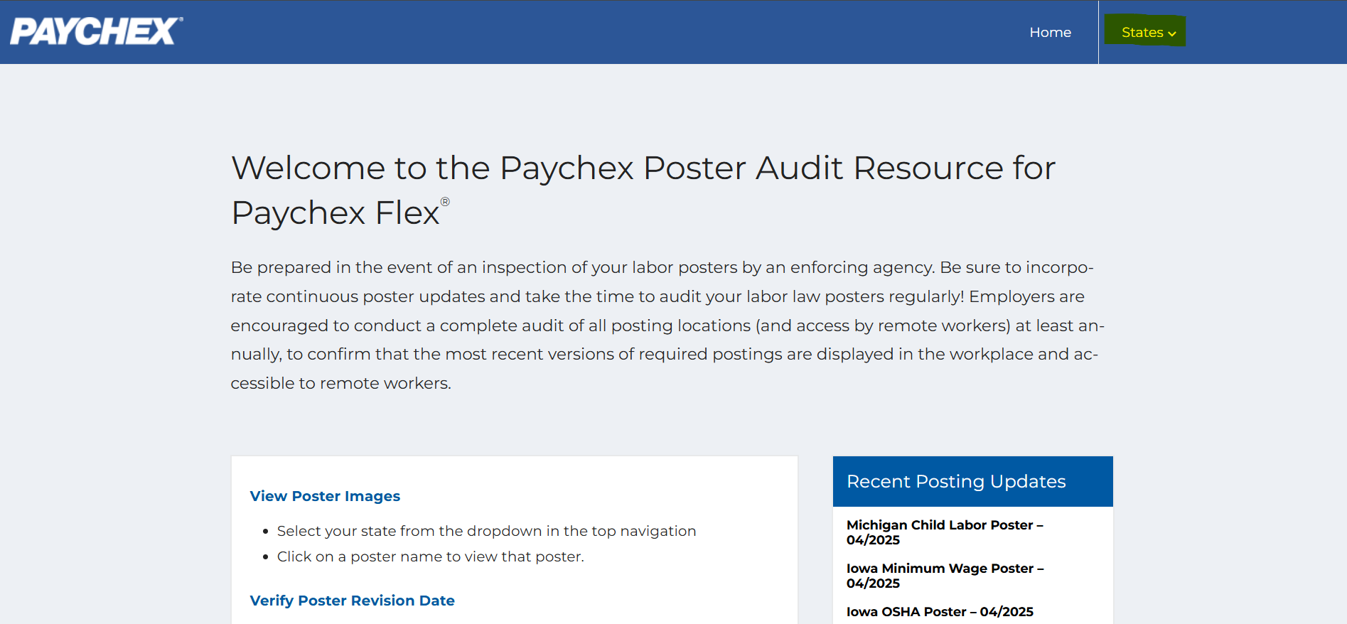 Since we are a remote office, we have the Labor Posters available online. To see the latest labor posters for your state, please use the following link. The state can be selected by using the drop-down menu in the top right corner.